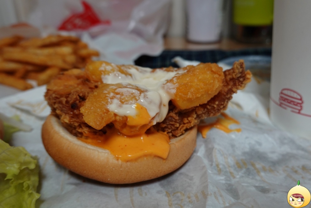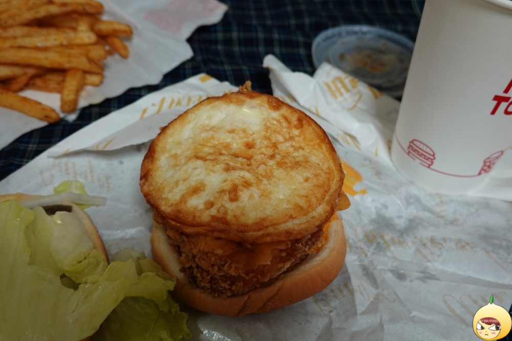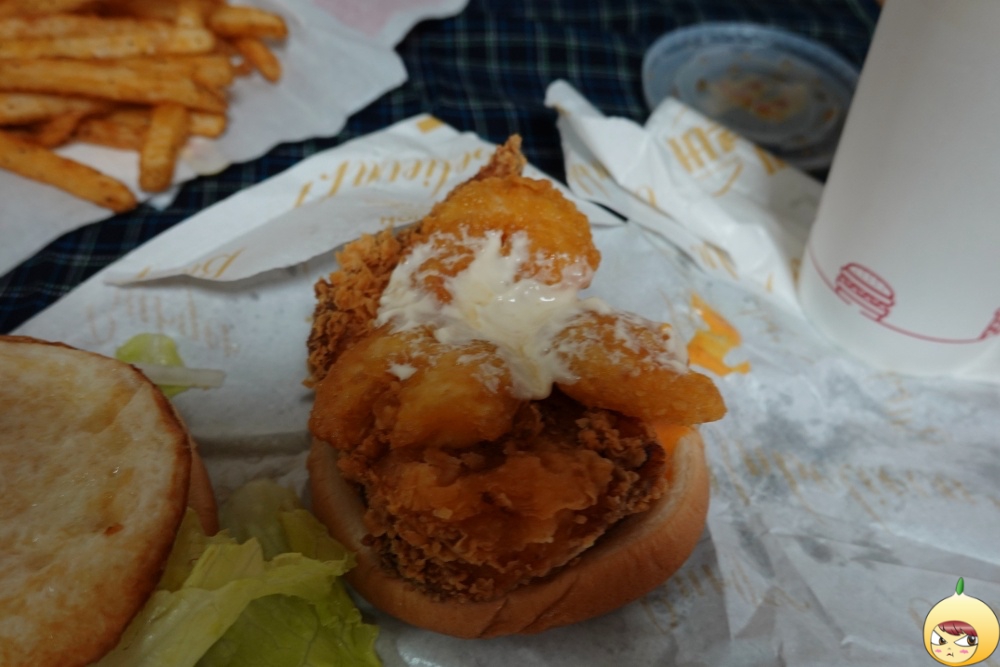 한 손에 들기 살짝 버거울 정도의 크기다. 이걸 한입에 다 먹어야 하는데, 작은 입이 감당을 못할 거 같다. 하는 수 없이 나눠서 먹어야 할 거 같다. 우선 애피타이저처럼 양상추부터 먹는다. 아삭아삭하니 입맛을 돋운다. 역시 계란후라이는 신의 한수다. 그저 빵하고만 먹었을 뿐인데도, 맛이 좋다. 그렇게 위에서부터 야금야금 내려오다 보니, 어느새 새우맛이 나기 시작하고, 곧이어 치킨맛도 났다. 크기와 퀄리티는 확실히 인정인데, 한꺼번에 다 먹을 수 없다는게 가장 큰 단점이다. 그리고 햄버거에 계란후라이는 선택이 아니라 필수다.