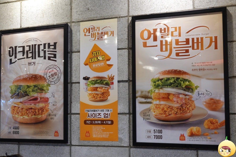 직원 왈, "매장에서 드시면 감튀가 사이즈 업이 됩니다." 그래도 어쩔 수 없다. 여기저기 묻히면서 먹는 내모습을 그 누구에게도 보이고 싶지 않다. 인크레더블로 버거도 먹기 힘들었는데, 언빌리버블 버거는 얼마나 힘들까? 각오를 미리 해둬야겠다. 버거 가격은 단품은 5,100원, 세트는 7,000원이다.