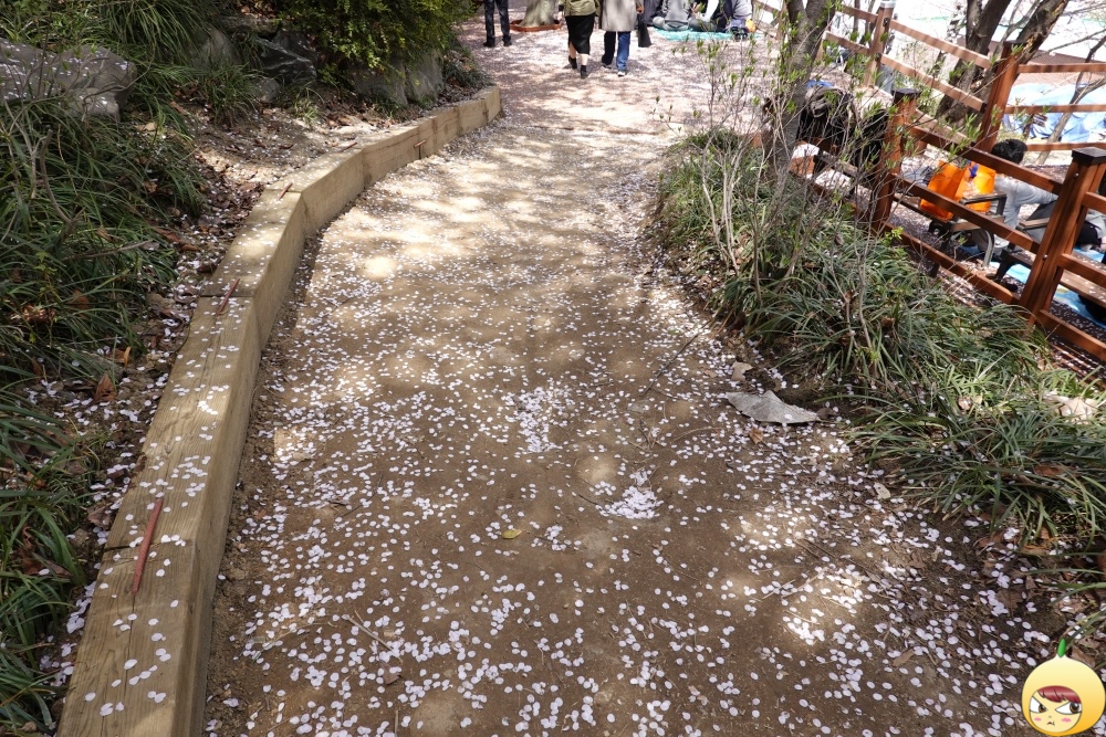 개인적으로 테미공원을 좋아하는 이유는 산은 산인데 동산이고, 오르는데 그리 힘들지 않아서다. 전망대가 있으니 높이가 꽤 되는 거 같지만, 등산 느낌보다는 그냥 산책이다. 일부러 월요일에 왔는데도, 사람이 많다. 하지만 인산인해까지는 아니다. 살랑살랑 불어오는 봄바람을 따라, 벚꽃이 비가 되어 내리고 있다.