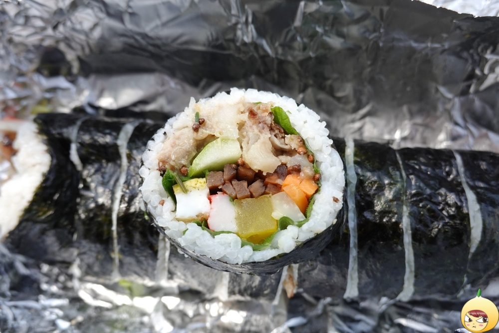 밥은 조금 내용물은 푸짐이다. 특히 위쪽을 차지하고 있는 건 온전히 떡갈비로, 꽤나 많이 들어 있다. 과다 떡갈비로 인해 고기 맛이 강하게 난다. 담백해서 매운 라면과 잘 어울릴 거 같은데, 김밥이 워낙 두툼해서 한 줄만 먹어도 든든하다.