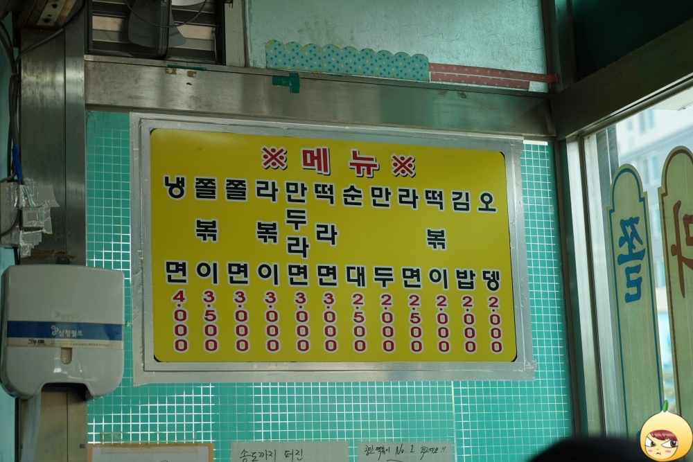 주문을 하기 전, 주변 테이블을 쓰윽~ 스캔했다. 김밥과 떡볶이는 기본으로 있고, 추가로 냉면, 순대, 만두가 있다. 그런데 그냥 떡볶이가 아니라 쫄볶이를 먹고 있다. 김밥, 떡볶이, 오뎅, 쫄면이 먹고 싶었으나, 혼자 왔으니 김밥(2,000원)과 쫄볶이(3,500원)를 주문했다. 그나저나 가격을 보고 있는데도 믿기 어려울 정도로 무진장 착하다. 전메뉴를 다 먹어도 32,500원이다.