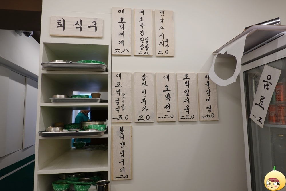 어쩜 이리도 비계만 싹 골라냈는지, 참 잘했어요. 사진을 찍고 있어서일까? 서비스로 호박식혜를 줬다. 그런데 넘 꽝꽝 얼려있어서, 이때는 맛만 보고 냉장고에 넣었다가 다음날 마셨다. 호박식혜이니 호박 맛이 난다. 그리고 달다. 메뉴판을 보니, 애호박강된장 덮밥이 있다. 찌개는 비계가 많아서 힘들 거 같으니, 다음에는 덮밥을 먹어야겠다.