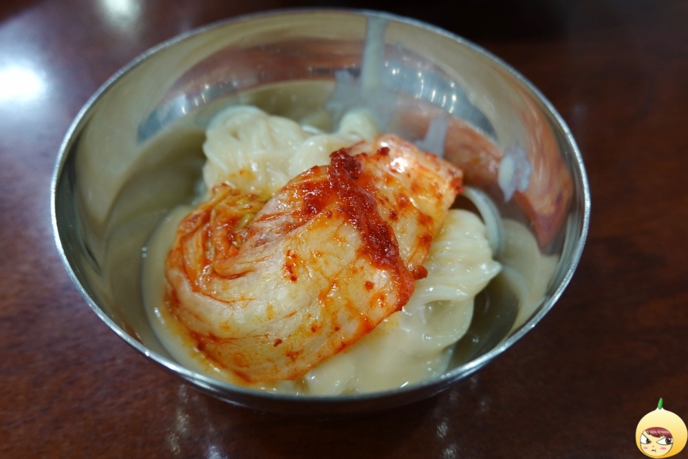국수를 만나기 전에 붉은 물든 김치가 먼저 들어왔다. 보쌈김치 스타일같은데, 무김치와 배추김치를 하나로 만든 거 같다. 김치에 대한 정보는 없었는데, 살짝 단맛이 돌지만 콩국수랑 같이 먹으면 감칠맛으로 바뀐다. 보기와 달리 매운맛이 약하니, 부담없이 막 먹어도 된다. 리필 여부는 모르겠다. 혼자 먹기 딱 적당할만큼 나와서 리필을 할 필요가 없었다.