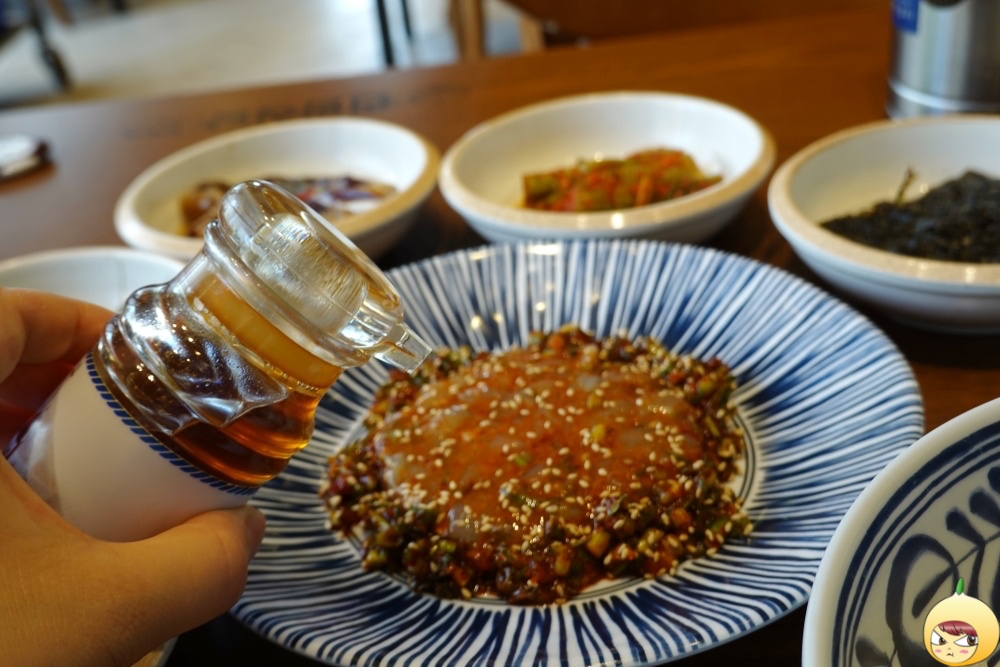 생각보다 꽃게살이 많구나 했는데, 자세히 보니 아래는 양념이다. 그 위에 꽃게살이 살포시 얹어져 있다. 먹는 법대로 참기름을 두른다.