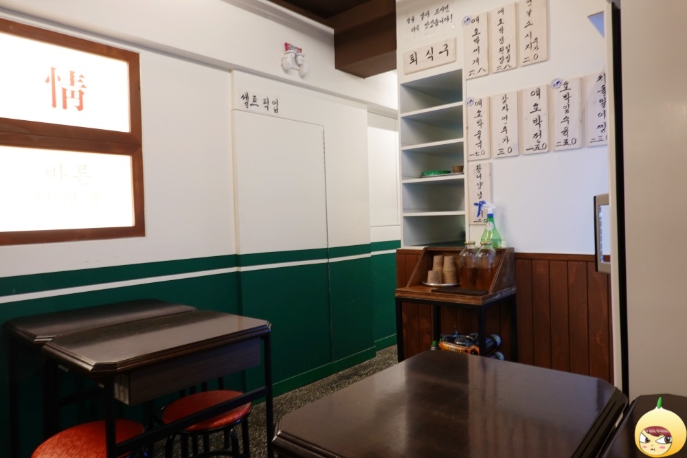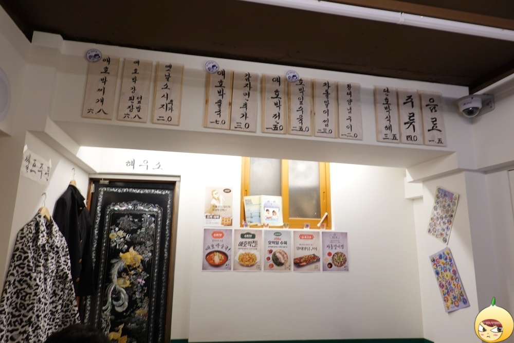 해우소로 가는 문이 자개장으로, 없던 교련복과 교복 그리고 딱지까지 생겼다. 메뉴판도 뭔가 뉴트로스럽게 변했다. 이번은 혼자가 아니고, 밥인듯 밥아니 술 한잔하러 왔으니 애호박술국(17,000원)을 주문했다.