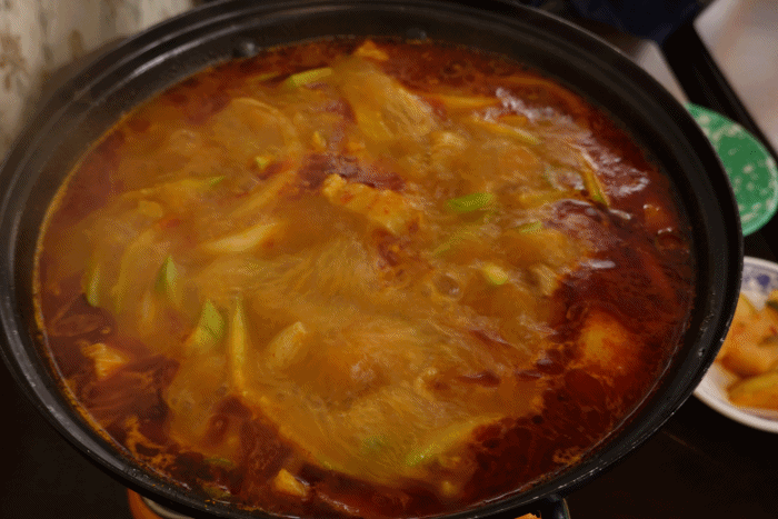 술국에는 밥은 없지만, 대신 감자면이 나온다. 술국에 처음부터 넣어서 먹어도 된다지만, 내용물을 좀 먹은 다음에 넣어서 먹으라고 해서 그렇게 했다. 1/2 정도 삶아서 나오니 살짝 끓이면 되지만, 너무 오래 끓이면 퍼질 수 있다.
