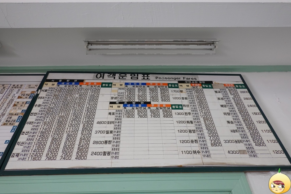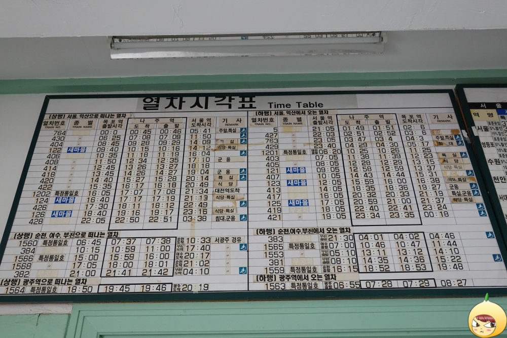 구나주역의 역사적 의미도 무지 중요하겠지만, 우선 "정말 쩔어~"(이런 표현을 쓰고 싶지 않지만 느낌을 살릴려면) 레트로에 뉴트로까지 요즘 복고 감성이 대세인데 여기만한 곳이 또 있을까 싶다. 페인트는 새로 한 듯 하지만, 나머지는 예전 느낌 그대로인 거 같다. 특히 열차시간표와 여객운임표는 옛날옛적에는(나주역사는 1960년대 모습으로 연출) 어느 역에 가도 다 있었을텐데, 어느새 디지털 문화에 익숙해지다보니 참 낯설다. 그러나 한편으로는 정겹고 애틋하기도 하다. 기차표를 판매하는 안쪽 공간 역시 보존이 잘 되어 있던데, 들어갈 방법을 몰라 창문을 통해 슬쩍 바라만 봤다.