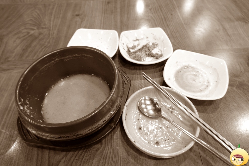 앞접시로 테스트를 했으니, 이제는 뚝배기에다 부추 투하다. 리필을 한번 하고, 깍두기 국물도 더했다. 맛이야 전혀 다르겠지만, 마치 돼지국밥을 먹고 있는 듯한 착각이 들었다. 진짜로 돼지국밥에 도전해볼까나. 그런데 부추를 더했기 때문일까? 땀이 더 많이 난다. '지금 흐르는 이땀은 노페물이다. 내 몸이 좋아지려고 땀으로 나쁜 것들을 배출하고 있는 거다.' 이렇게 자기합리화를 하면서 계속 먹었다.