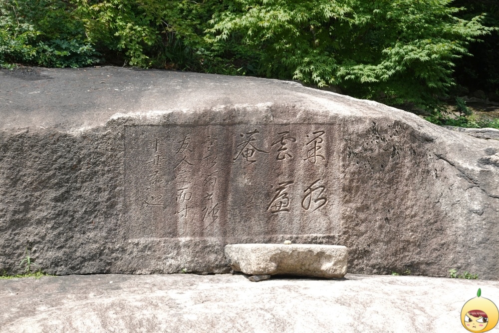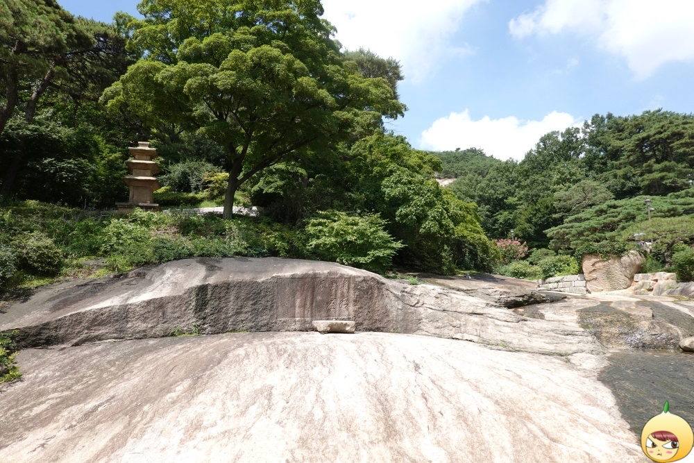 석파정을 짓기 전부터 있었다고 전해지는 바위라고 한다. 바위에 새겨진 글귀는 "소수운련암 한수옹서증 우인정이시 신축세야" 뜻은 물을 품고 구름이 발을 치는 집. 석파정은 인왕산 자락에 있고, 인왕산은 암벽이 많은 산이니, 이곳에 바위가 있다는 건 그리 기이하지 않다.