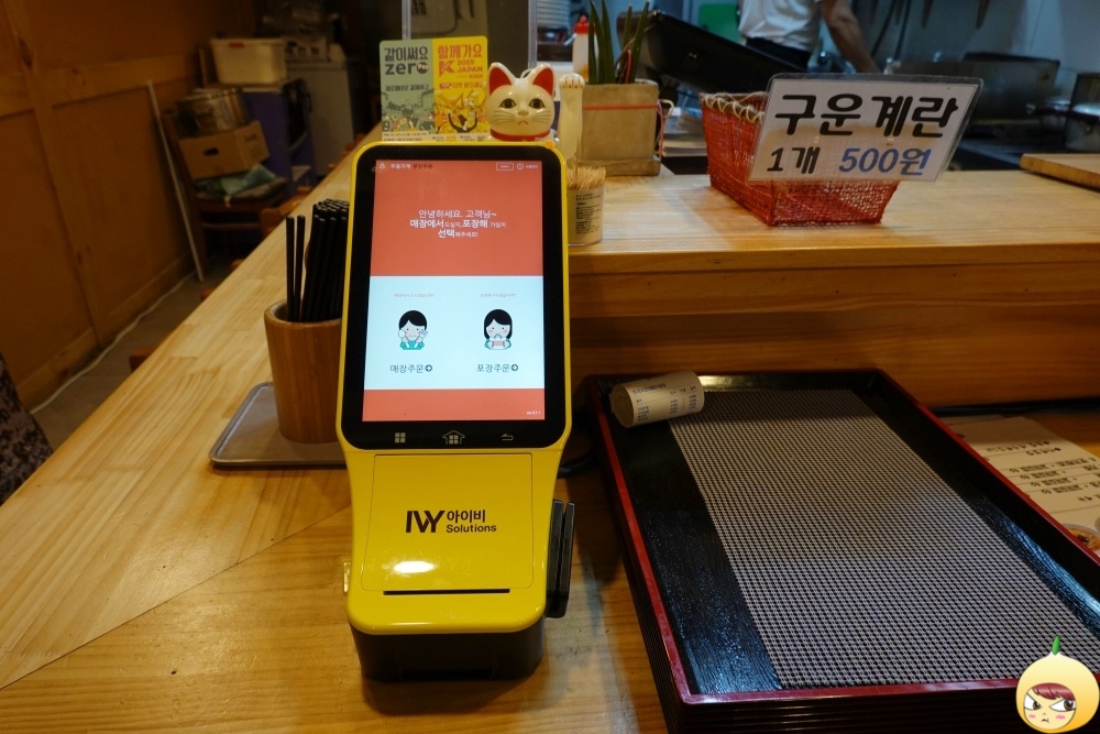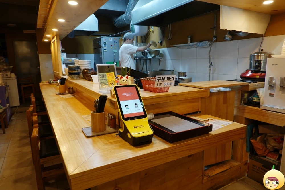 주인장 혼자 운영을 하는 곳이니, 계산부터 다 셀프다. 조그만한 기계에 뭐 먹을지 선택하면 된다. 메뉴가 많지 않으니, 키오스크 사용도 쉽다. 먼저 매장과 포장으로 선택을 한 후, 어떤 우동을 그리고 어떤 사이트와 음료를 선택하면 된다. 결제는 카드로 해서 직접 긁거나 안으로 넣으면 끝이다. 주문이 끝나면, 주인장은 기계에서 면을 뽑고 삶는다. 그리고 몇 분 후, 음식이 나오면 테이블로 갖고 오면 된다. 그전에 김치와 단무지 그리고 물은 셀프이니 미리 세팅해 놓는다.