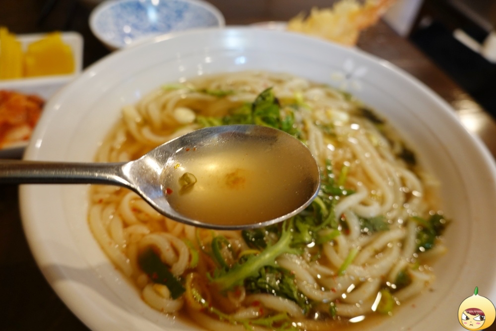쑥갓을 국물 속으로 넣기 전과 후 국물맛은 확연히 다르다. 고로 쑥갓을 좋아해서 바로 먹거나, 싫어해서 빼면 안된다. 은은한 멸치향이 흐르는 담백한 국물에 쑥갓이 더해져 향긋한 국물맛으로 변한다. 멸치향이 강하게 느껴질때, 쑥갓이 고걸 또 적절하게 눌러준다. 그리고 쑥갓과 더불어 고춧가루 역시 절대 빠지면 안된다. 후추같다고나 할까? 매운맛까지는 아니지만, 단조로울 수 있는 국물맛을 한층 더 다채롭게 만들어 준다. 국물 우동인 탓에 시간이 지날수록 면의 쫄깃함은 사라지지만, 워낙 국물이 좋으니 괜찮다.
