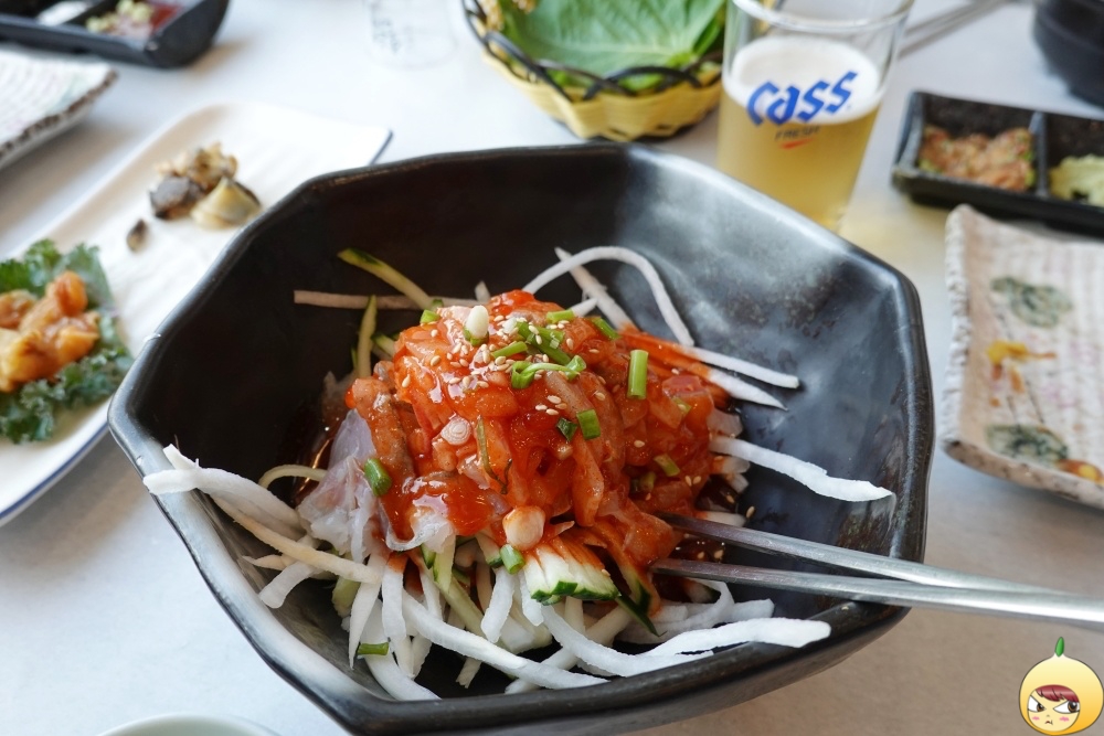 새콤달콤한 양념과 아삭한 식감이 좋은 회무침. 회가 있는 거 같은데, 어째 오이와 무만 보인다. 주인공이 맞이하기 위해, 공간을 만들어줘야 하니 먹어서 없애버렸다.