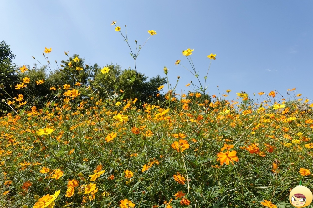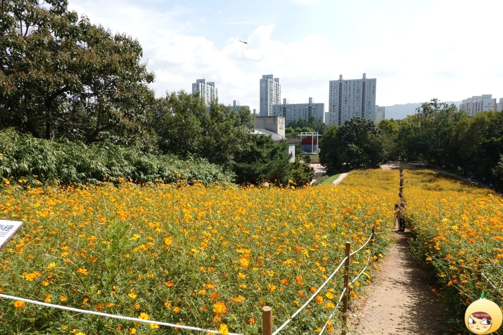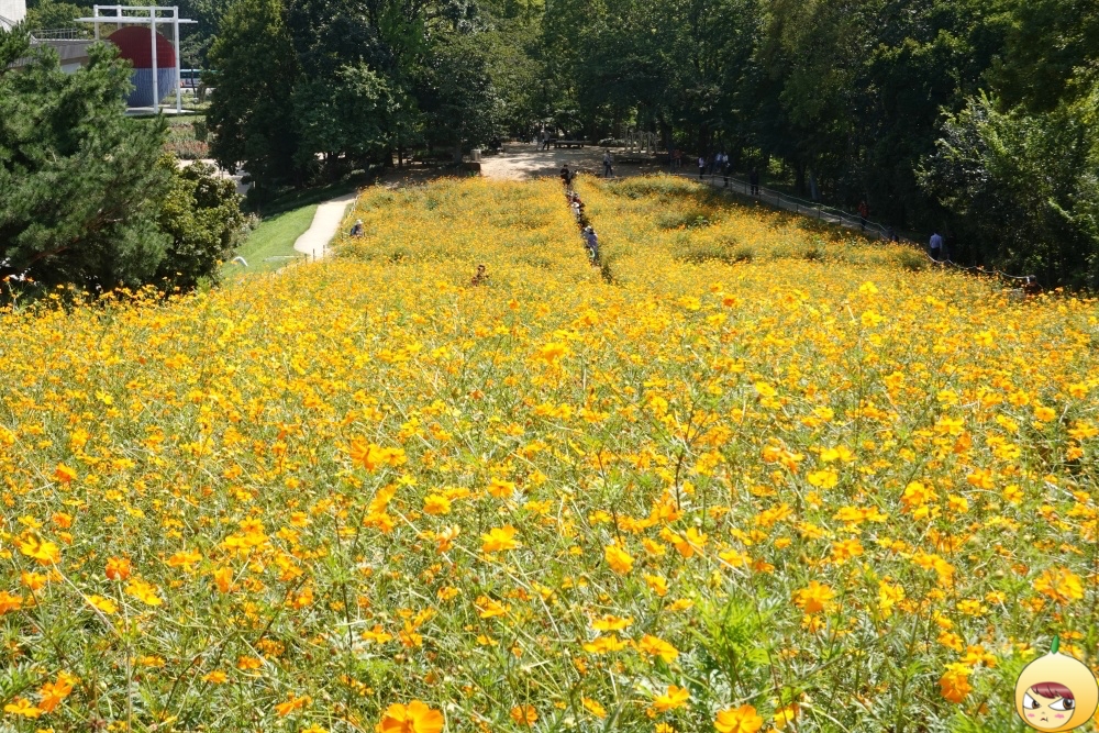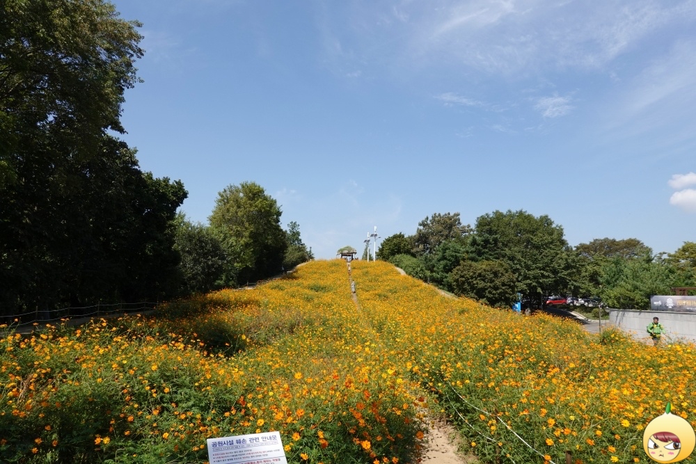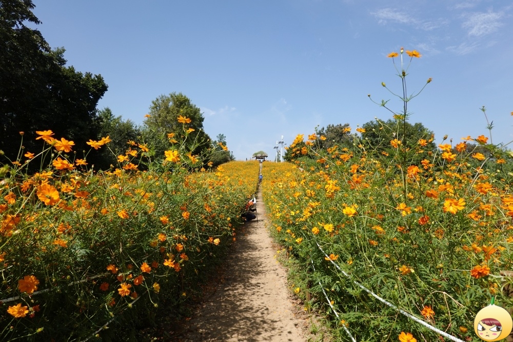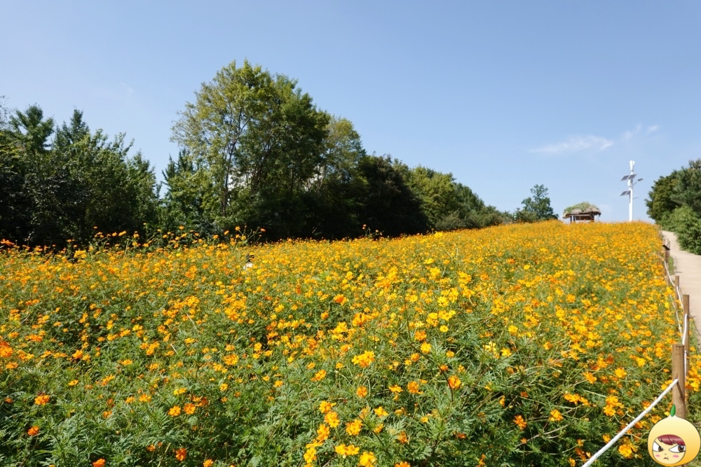 들꽃마루 뒤편에도 대단한 무언가가 있을거라 생각했는데, 음... 안내문에는 센세이션 코스모스라고 우리가 흔히 아는 그 코스모스가 여기에 있단다. 개화시기가 노랑코스모스(7~8월)와 달리 9~10월이라서 아직은 숨어 있나보다. 다 봤다면 더 좋았을테지만, 욕심을 내지 않기로 했다. 노랑 물결만으로도 행복했으니깐.