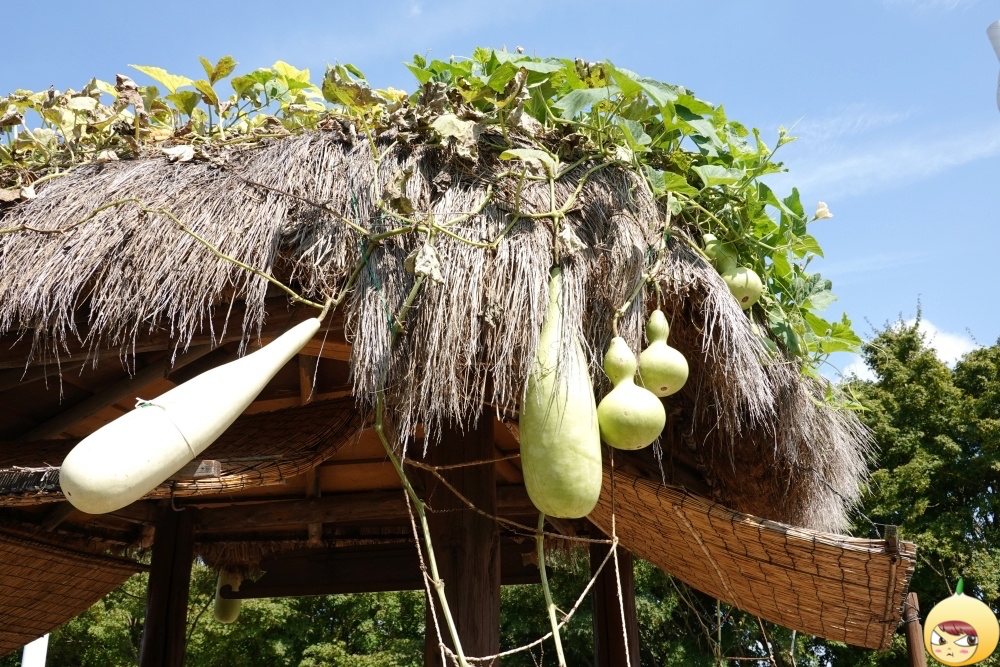 오두막에 앉아볼까 했지만, 빈 공간이 없다. 하는 수 없이, 모형인지 진짜인지 알 수 없지만 주렁주렁 탐스럽게 달린 조롱박만 담았다. 제비가 물어다 준 박씨일까? 쓸데없는 상상은 그만~