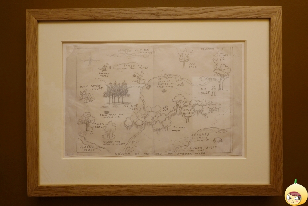 밀른과 쉐퍼드는 크리스토퍼 로빈과 푸 그리고 그들의 친구들이 등장하는 주요장소들을 표시한 100에이커 숲의 지도를 만들었다. 저 지도만 있으며 로빈과 푸 그리고 친구들의 집이 어디에 있는지 알 수 있다. 이야기의 대부분도 주로 숲에서 일어난다. 여기서는 그림만 전시되어 있지만 영상을 볼 수 있는 3전시실에서 지도는 큰 몫을 담당하게 된다.