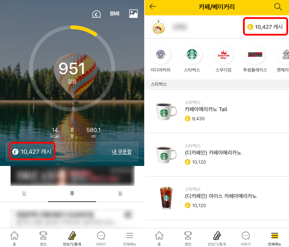 캐시워크는 올해초, 지인으로부터 알게 된 앱이다. 걷기만 해도 돈을 버는 만보기라니, 당장 다운을 받고 그날부터 계속 열렬히 사용 중이다. 하루에 만보를 걸으면 100캐시가 생기는데, 딱 거기까지다. 만보를 넘게 걸어 11,000 이렇게 나와도, 캐시는 100이다. 하루에 만보걷기 그리 어렵다고 생각 안했다. 고로 하루에 100캐시를 100일 모으면 10,000캐시가 된다. 그럼 별다방 커피를 걸음값으로 마실 수 있다.