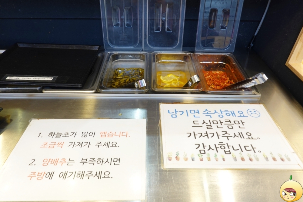 주문도 셀프, 반찬도 셀프다. 음식은 가져다 주겠지 했는데, 푸드코트처럼 벨이 울리면 가져와야 한다. 음식을 가져올때, 반찬을 담아서 오면 된다. 먹을만큼만, 남기면 다 쓰레기가 된다.