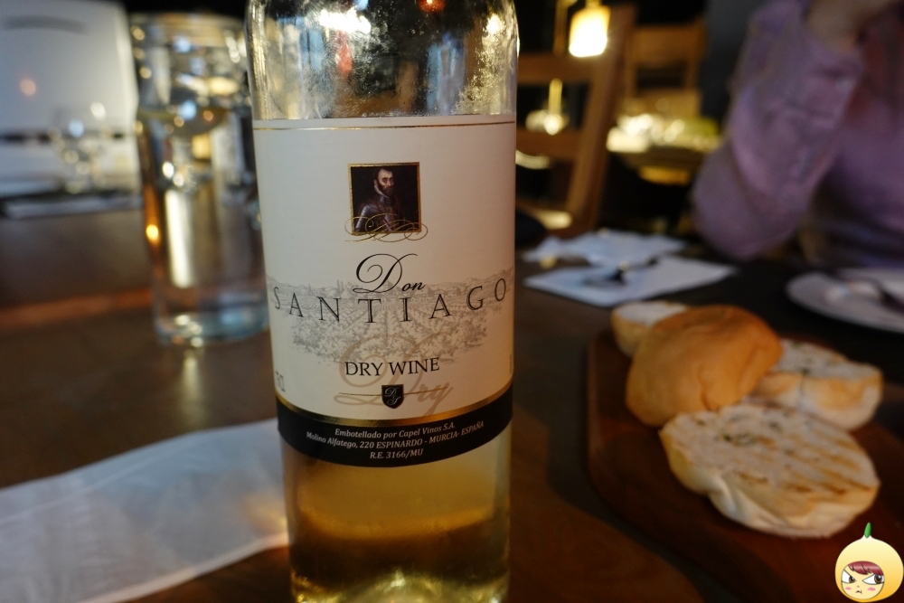 스페인 돈산티아고 화이트 와인(18,000원). 감바스의 오일리함을 싹 잡아주는 드라이 와인이다. 주인장 취향에 따라 고른 와인이라는데, 우리의 취향과도 일치했다.