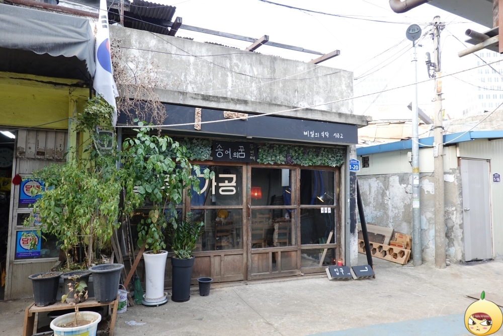 시즌1은 대로변에 있어서 쉽게 찾을 수 있었는데, 시즌2은 안쪽에 있다. 큰 거리에서는 보이지 않지만, 철공소와 철공소 사이 안쪽으로 들어갈 수 있는 작은 공간을 지나면 조그만한 구멍가게가 나오고 송어의 꿈은 그 옆이다. 딱봐도 시즌2가 되기 전에 철공소였을거다. 유리창에 있는 '가공'이라는 글자를 지우지 않은 건, 분위기 깡패를 만들기 위한 주인장의 깊은 뜻인 듯. 그나저나 저 안으로 들어가야 하는데, 유리문을 열 수가 없다. 아래를 보니, 입구는 돌아서 가야 한단다.