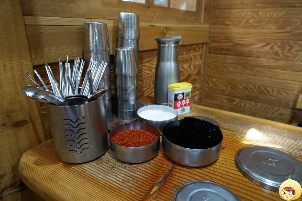 테이블에는 소금과 후추, 고춧가루 그리고 조미김이 있다. 양념은 아마도 뭇국용일 듯 싶다. 김과 후추만 사용할 예정이라서, 사진만 찍고 후다닥 빠르게 뚜껑을 덮었다.
