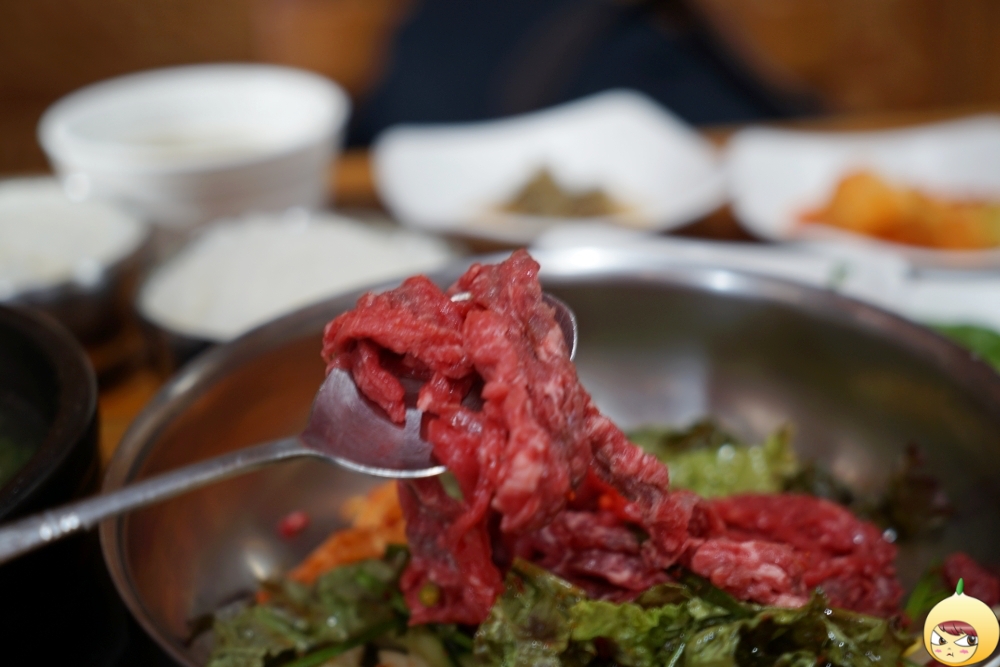 육회는 따로 양념이 되어 있지 않고, 빨간양념이 속에 들어있다. 부추, 오이, 상추, 콩나물 등 채소에는 양념이 되어 있다. 그리고 그릇 아래 비빔밥에 꼭 들어가는 참기름이 있어야 하는데, 고소보다는 구수가 더 강한다. 참이 아니라 들기름일 거 같은 느낌적인 느낌이다.