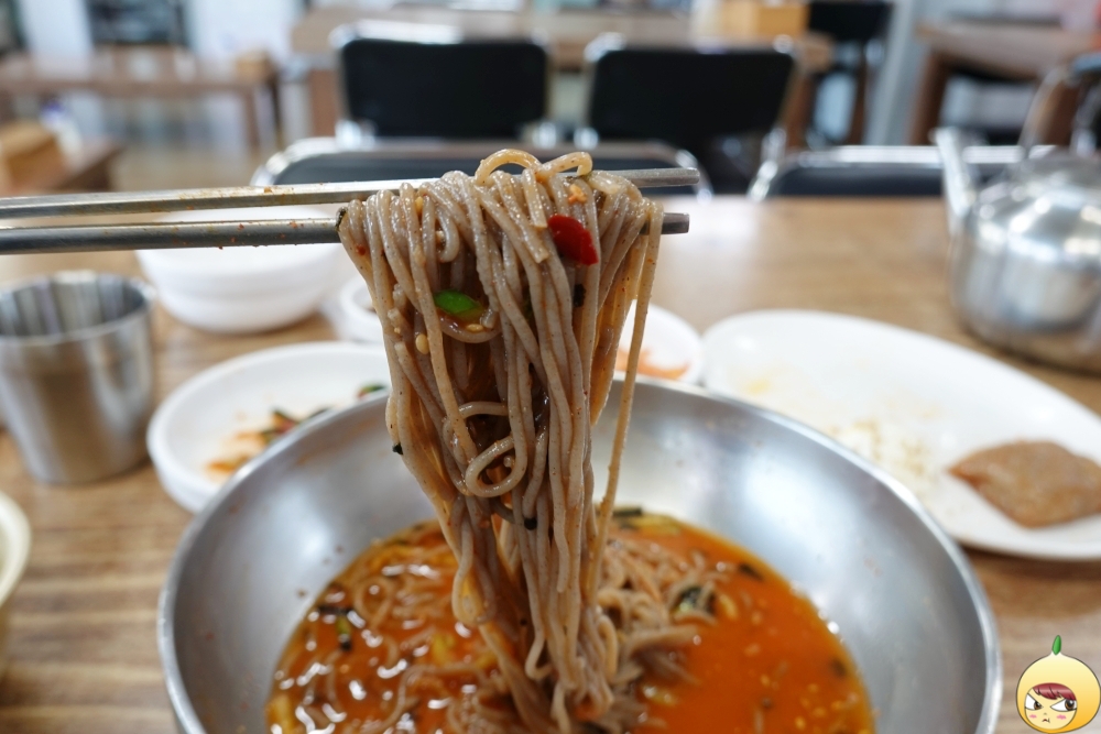 과하지 않고 소박하지만, 그 속에 담긴 구수하고 담백한 맛은 사람을 기분좋게 해준다. 맵지 않은 빨간 양념에 무심하게 툭 올려진 오이채 그리고 없으면 서운한 김가루까지 투박한 막국수를 빛내주는 주역들이다. 그런데 여기서 놓쳐서는 안되는 대단한 녀석(?)이 있다. 비주얼용이라고 생각하면 오산, 알게 모르게 고소함을 담당하고 있는 참깨다. 양념에 참기름이 들어있겠지만, 개인적으로 챔기름보다는 챔깨가 더 좋다.