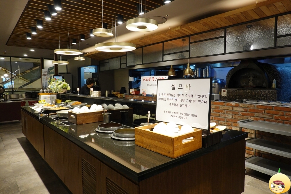 반찬을 리필하고 싶으면, 셀프바를 찾으면 된다. 누룽지, 된장국이 있고, 잡채같은 당면볶음 그리고 우유처럼 보이는 건 콩비지다. 이외 총각김치와 샐러드도 있다. 첫 상차림은 직원이 해주는데, 된장국과 비지, 누룽지는 없으니 미리 챙겨와야 한다.