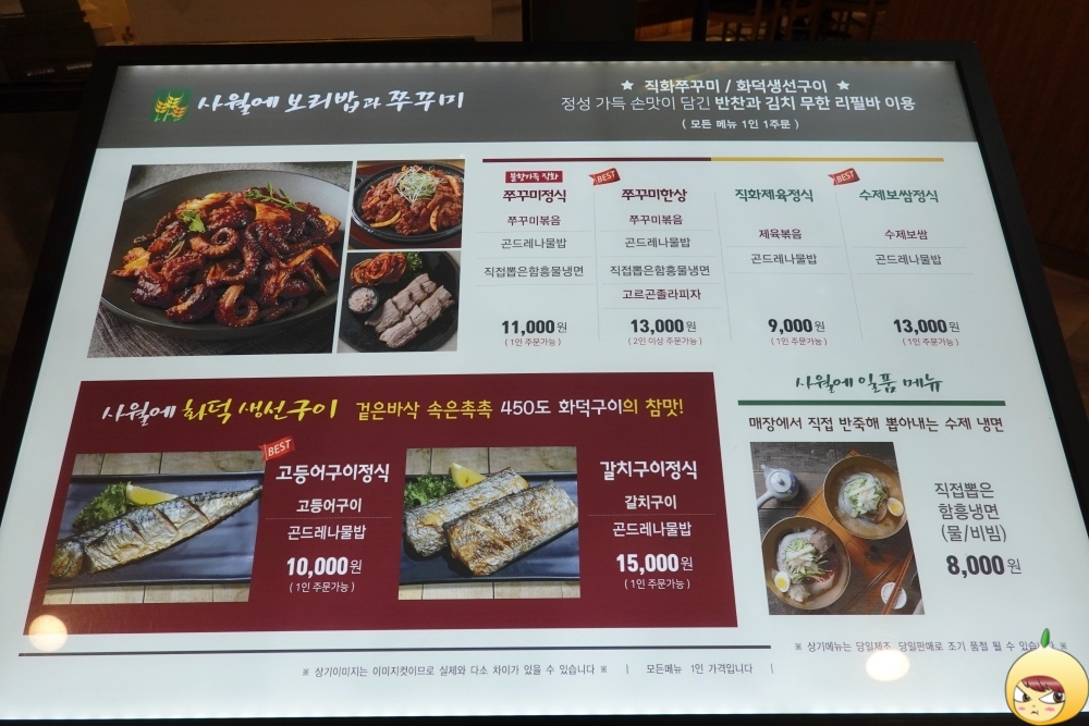 둘이 왔다면, 고르곤졸라피자가 나오는 쭈꾸미한상을 먹을텐데, 혼밥이라서 쭈꾸미정식(11,000원)이다. 고등어구이정식도 끌렸지만, 함흥냉면이 없다.