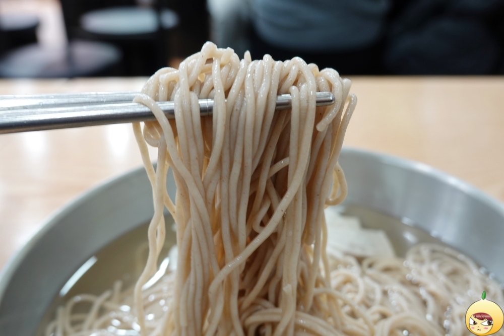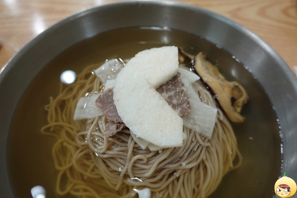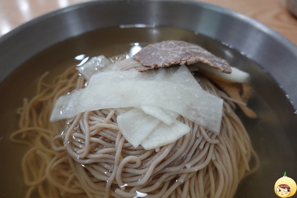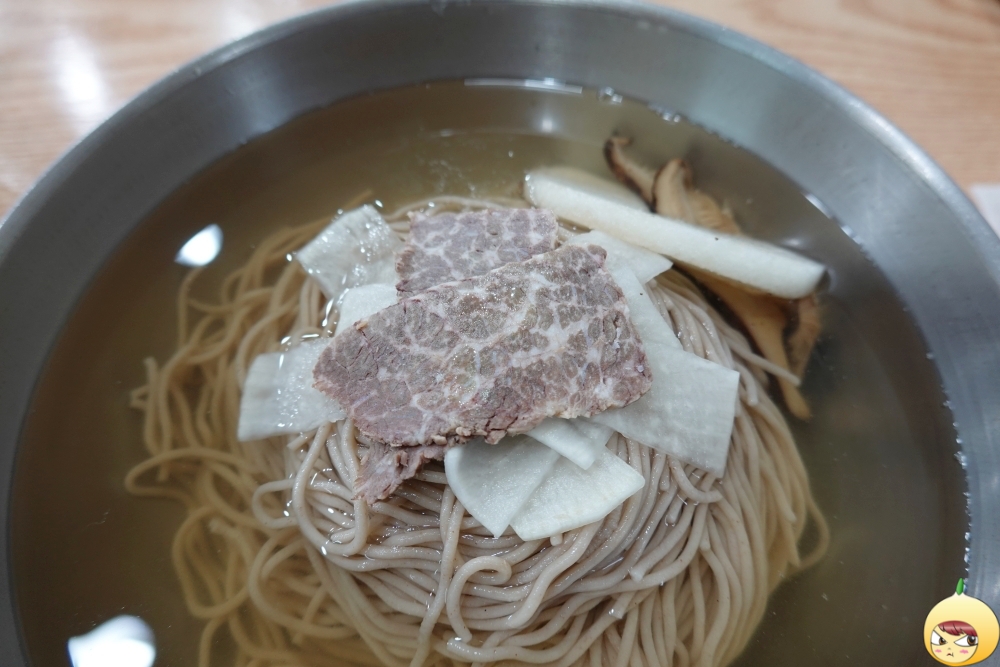 비주얼은 평양냉면인데 맹물처럼 느껴지는 기본 평냉과는 확연히 다르다. 아까 봤던 면수보다는 연하지만, 갈색을 띤다.