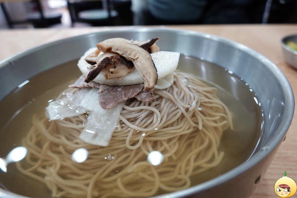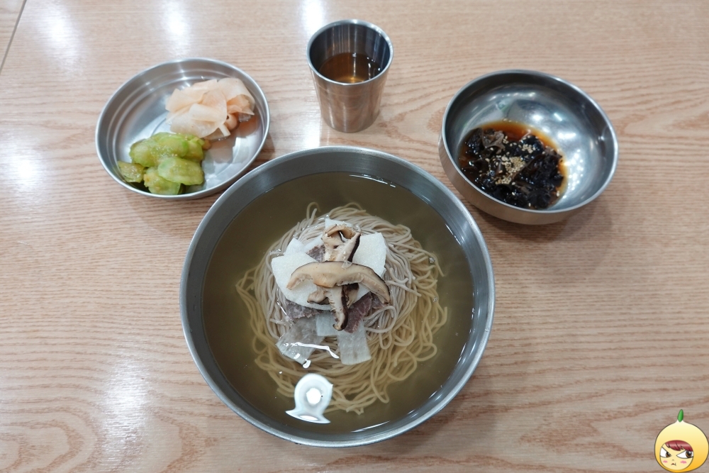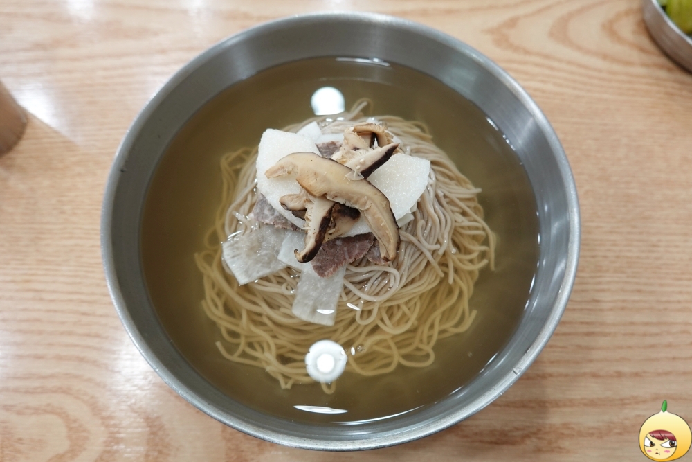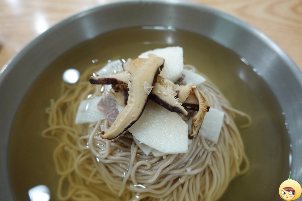 사진 찍다 너무 궁금해 육수를 살짝 마셨는데, 떄깔도 다르듯 맛도 다르다. 기존 평양냉면과 달리 육향은 강하지 않은데, 다른 향이 함께 느껴진다. 표고버섯이 고명으로 있으니, 버섯 육수일까? 역시나 잠시후에 공개.