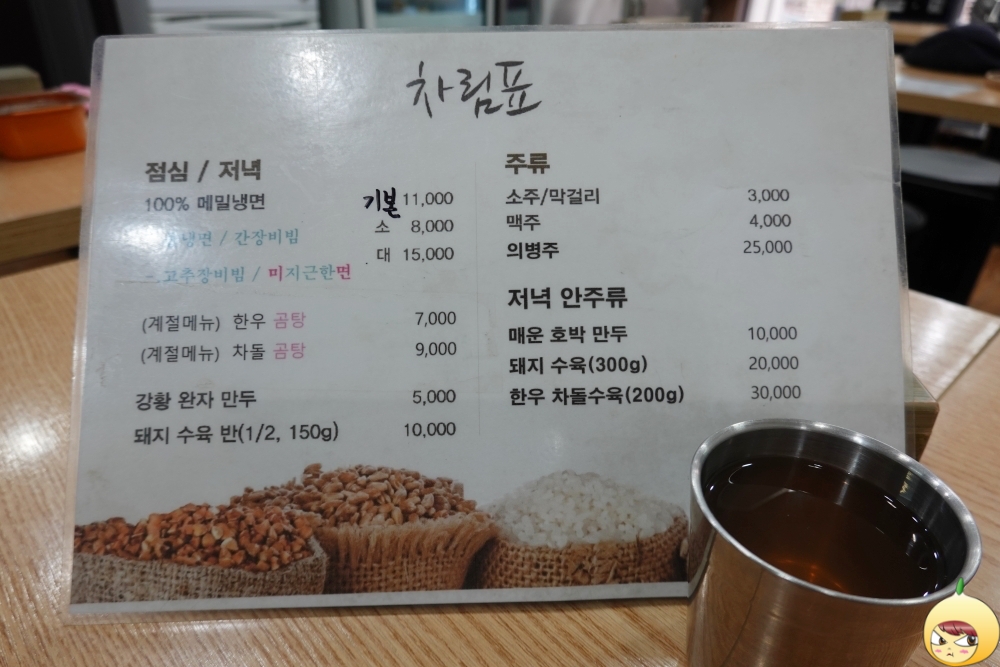 오른쪽 메뉴는 관심이 없고. 왼쪽 상단에 있는 100% 메밀냉면만 보면 된다. 4가지 메밀냉면이 있는데, 물냉면, 간장비빔, 고추장비빔 그리고 미지근한면이 있다. 처음 왔으니 물냉면 기본(11,000원)을 주문했다.