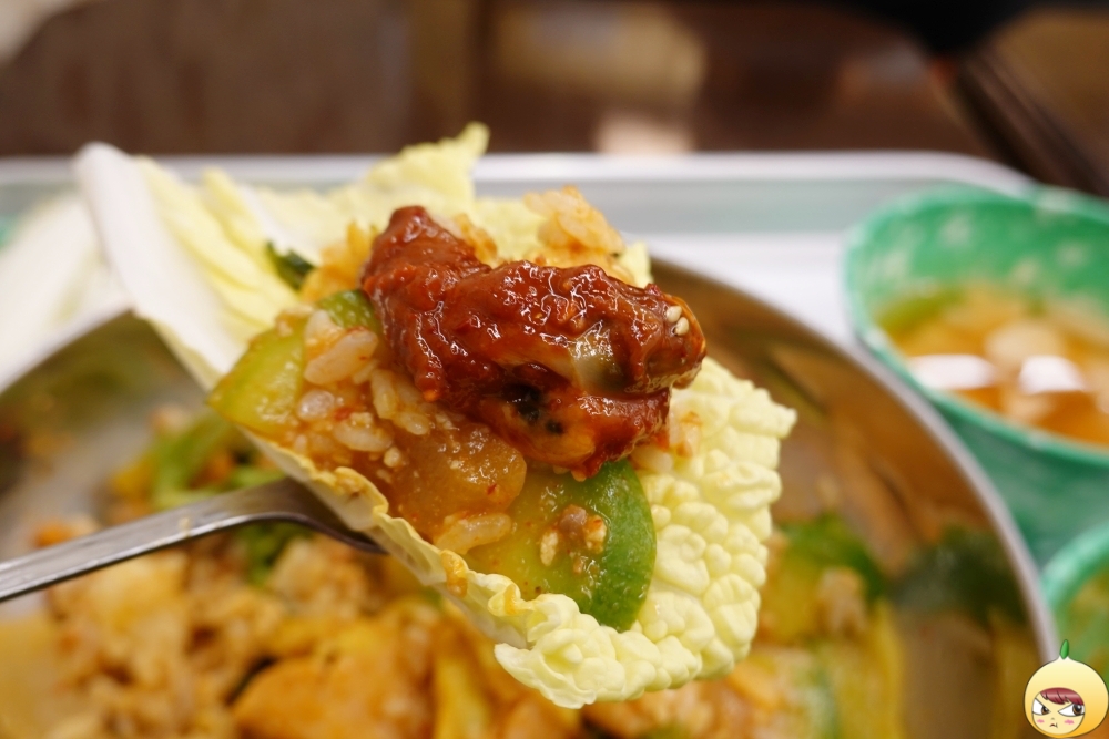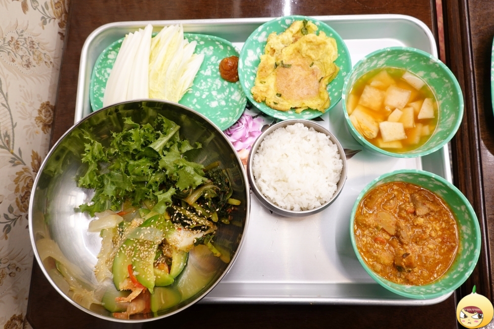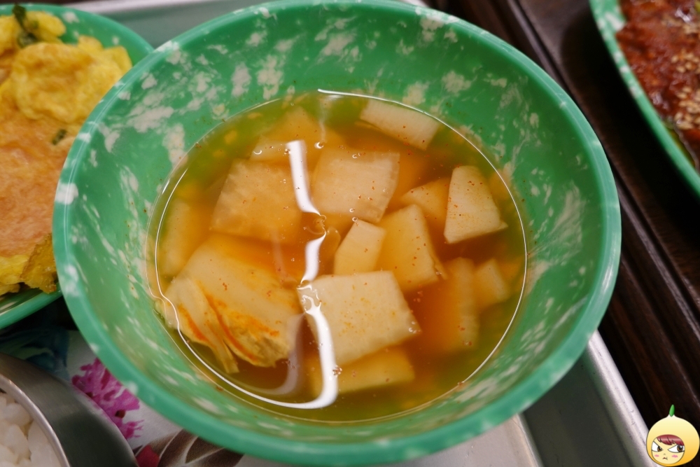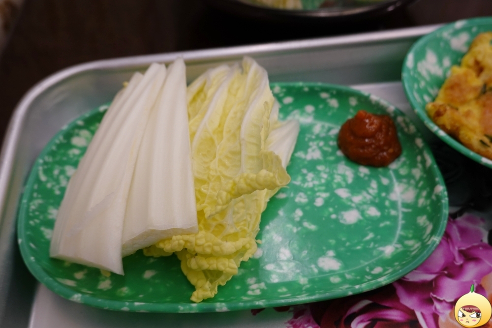뜨끈한 국물이면 더 좋았을테지만, 나박물김치가 나왔다. 늘 오이가 나오더니, 이번에는 노란 알배추가 나왔다. 쌈장에 찍어 먹어도 되지만, 배추쌈으로 먹었다.