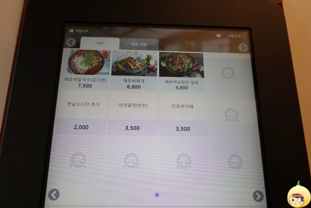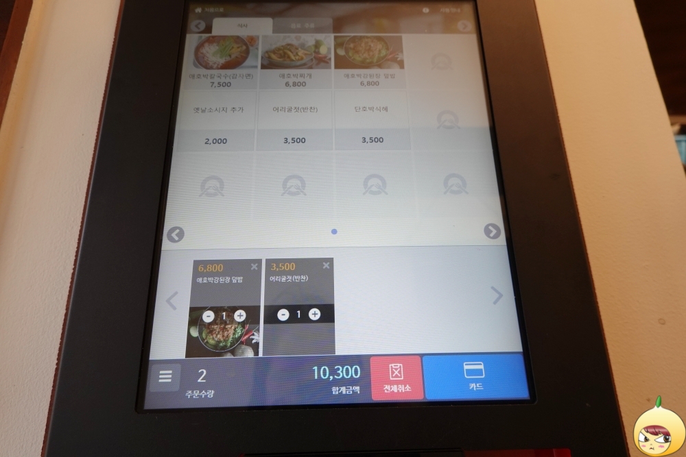 들어가자마자 주문받는 기계가 있다. 내 맘 속에는 어리굴젓이 메인 요리지만, 현실은 아니다. 고로 어리굴젓과 가장 어울릴 거 같은 애호박간된장 덮밥(8,600원)을 주문했다. 물론 어리굴젓(3,500원)도 주문했다. 개인적으로 공깃밥에 어리굴젓만 있으면 되는데, 반찬이라고 나와 있으니 단독 주문은 안될 듯 싶다. 혼밥이니, 메인 하나에 추가 반찬 하나다.