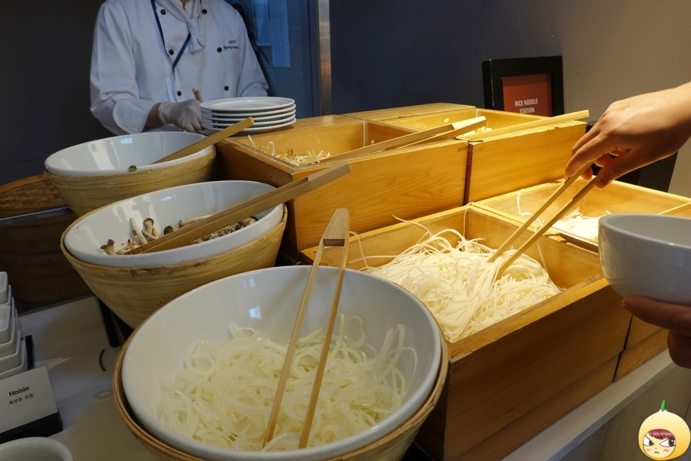 쌀국수를 먹기 위해서는 줄을 서서 기다린다. 원하는 재료를 직접 담을 수 있고, 즉석에서 바로 만들어 주니 인기가 없을 수 없다. 조식은 6시 30분부터 9시 30분까지로 7시 30분 전에 오면 한산하게 먹을 수 있다는데, 8시가 넘어서 갔다. 그러다보니 음식이 있는 곳에서 가장 먼 테이블에 앉아야 했고, 밥 한번 먹기 위해서는 머나먼 여정(?)을 떠나야 했다.
