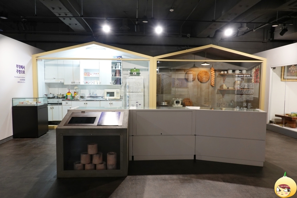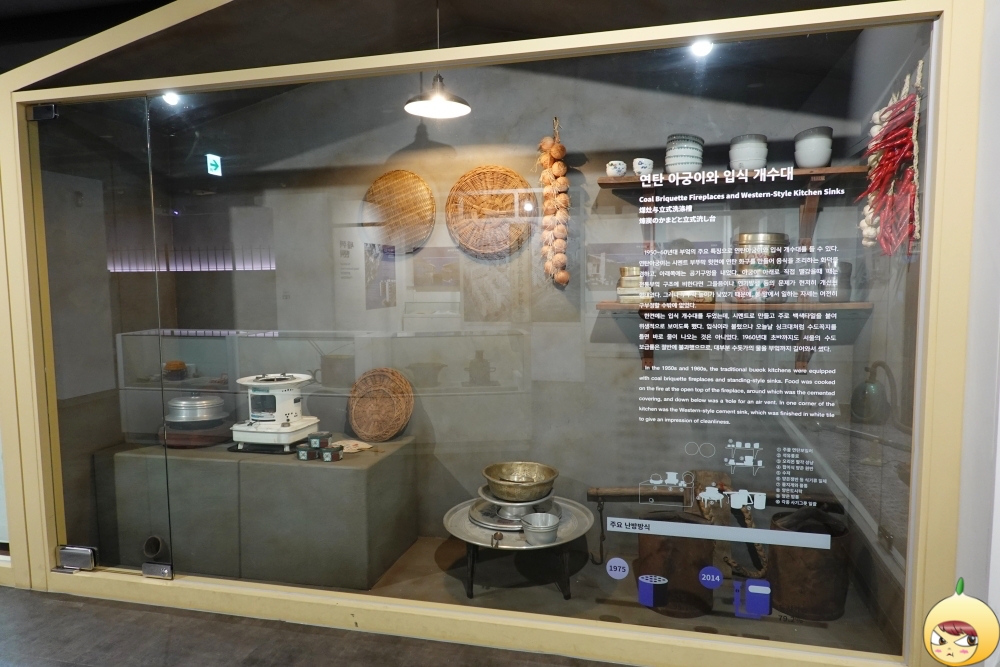 연탄아궁이는 시멘트 부뚜막 윗면에 연탄 화구를 만들어 음식을 조리하는 화덕을 겸하고 아래쪽에는 공기구멍을 내었다. 전통부엌 구조에 비한다면 그을음이나 연기발생 등의 문제가 현저히 개선됐지만, 높이가 낮아 일하는 자세는 여전히 구부정했다. 입식 개수대는 시멘트로 만들고 위생적으로 보이기 위해 백색타일을 붙였다. 말이 개수대이지, 1960년대 초반까지도 서울의 수도 보급률은 절반에 불과, 대부분 수돗가의 물을 부엌까지 길어와서 썼다고 한다. 어릴때 곤로 특유의 기름냄새를 좋아하면 몸 안에 기생충이 있다고 했는데, 그때는 말하지 못했지만 사실 곤로 냄새를 엄청 좋아했었다.