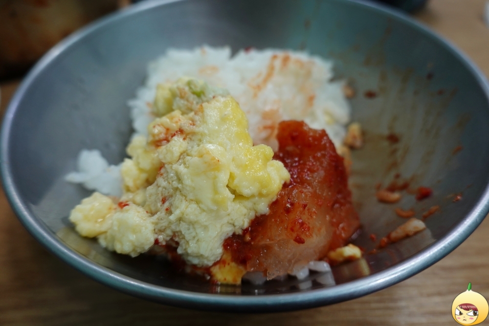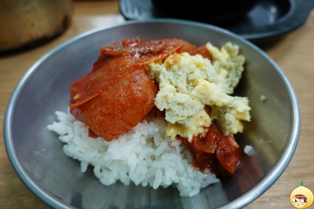 마지막 갈치 한점을 남겨두고, 이제는 비빔이다. 달큰한 무와 빨간 양념 여기에 계란찜을 더해 쓱 비빈다. 김에 비빔밥을 올리고 갈치살을 더하면 완벽 그자체다.