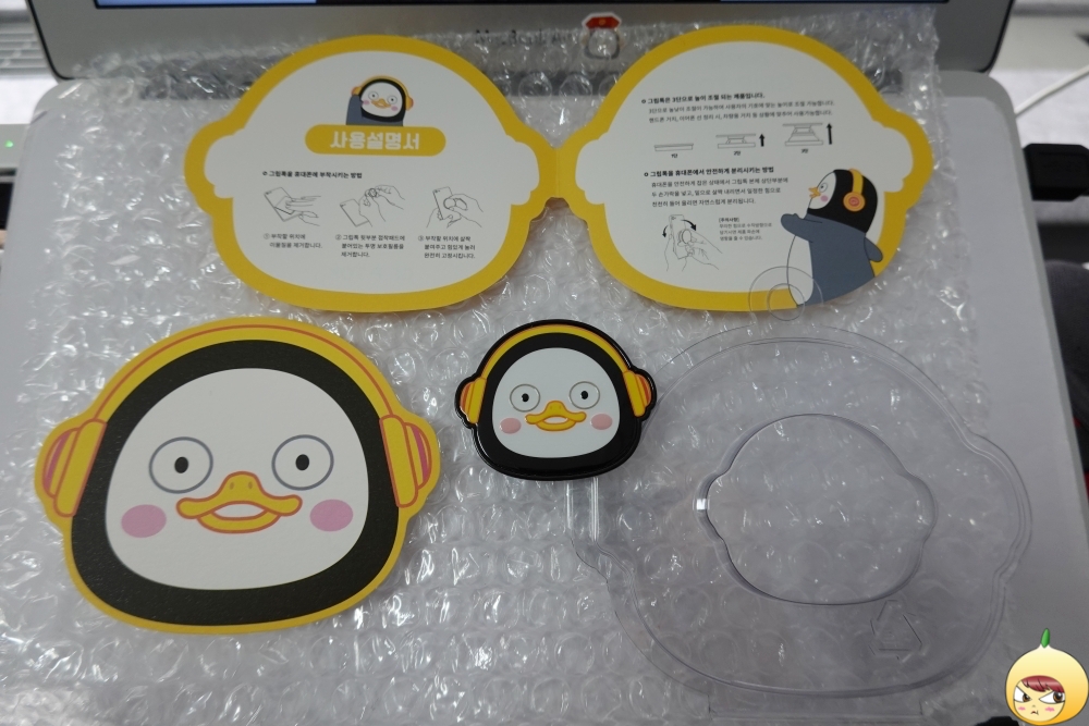 펭수 얼굴형 스마트 그립톡 슬림 휴대폰 거치대에는 그립톡과 함께 펭수 얼굴모양의 메모지 그리고 사용설명서가 들어있다. 일러스트 캐릭터이지만, 그래도 좋다. 왜냐하면 무지 갖고 싶었으니깐.