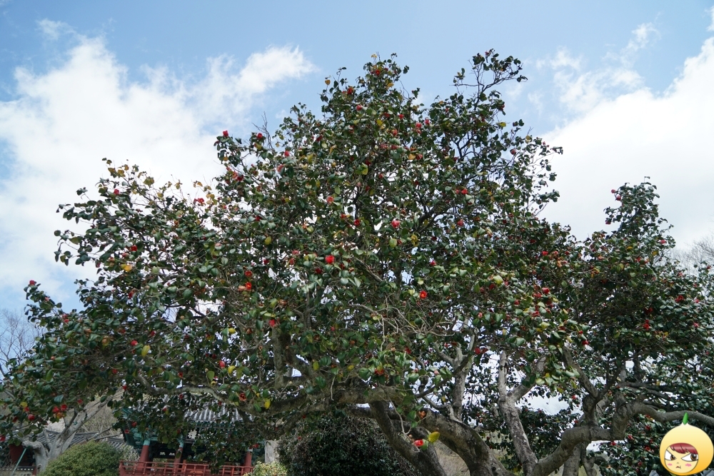 충렬사 입구 길 양쪽으로 늘어서 있는 동백나무는 본래 네그루였으나 지금은 두그루만 남아 있다고 한다. 나이는 400여 년 정도 추정되며, 키는 6.3m, 둘레는 1m다. 사방으로 넓게 퍼진 가지는 지금이 7m나 된단다. 통영에서는 음력 2월이면 거센 바닷바람을 달래기 위해 풍신제인 할만네를 지내는데, 그때 동네 아낙들이 정한수 물동이에 동백꽃을 띄우는 풍습이 있다.