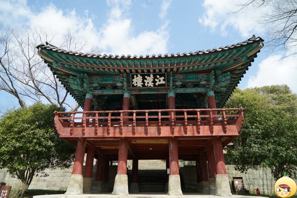 옛부터 충렬사를 찾은 많은 시인 묵객들이 강한루 위에 올라 충무공의 큰 덕을 되세기며 동백 고목과 더불어 후원의 푸른 죽림을 자주 시제에 올렸던 누각이다. 젼형적 조선의 팔작지붕 양식으로 1988년에 복원 되었다.