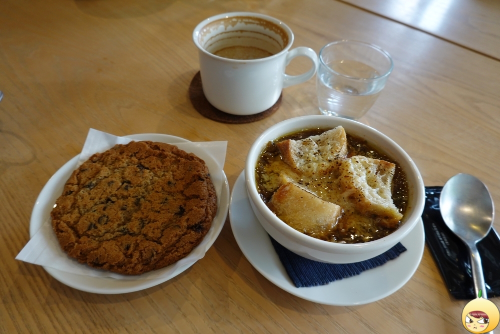 약 30분 후, 어니언스프와 함께 나온 건, 통밀초코칩쿠키다. 이렇게 크고 거대한 초코칩쿠기는 처음이다. 그리고 바게트와 치즈로 치장을 한, 진한 갈색빛 어니언스프가 짠하고 내 앞에 나타났다.