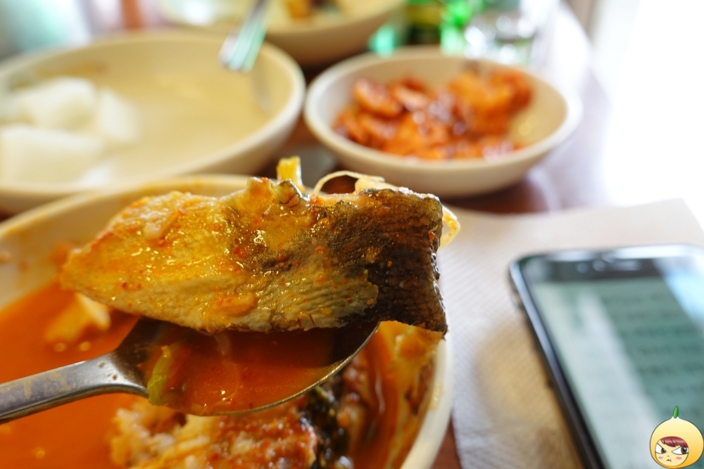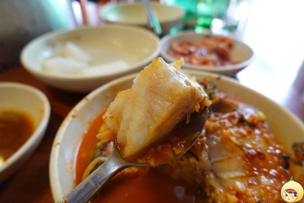 1인분에는 커다란 대구 한토막과 내장(이리 2~3개)이 조금 들어 있나보다. 순식간에 내장을 먹고 나니, 이제 남은 건 대구살이다. 거대한 토막답게 살도 꽤나 도톰하다. 빨간양념이지만 맵지 않아서, 대구살의 담백함을 충분히 즐길 수 있다.