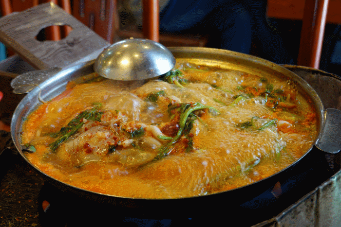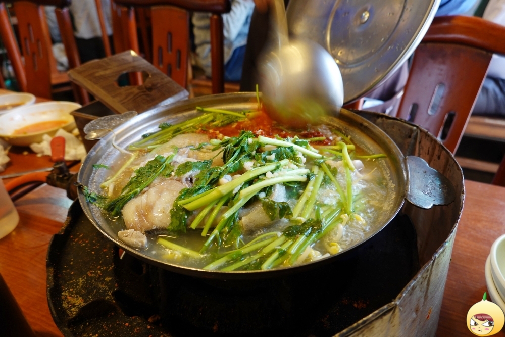 대구탕이 어느 정도 끓기 시작하면 직원이 와서 커다란 국자로 양념이 골고루 섞이도록 젓어준다. 그리고 팔팔 끓기 시작하면, 다시 와서 야채부터 골라 먹으라고 알려준다. 대구와 내장은 아직 익지 않았기에 미나리와 콩나물만 먹어야 한다.