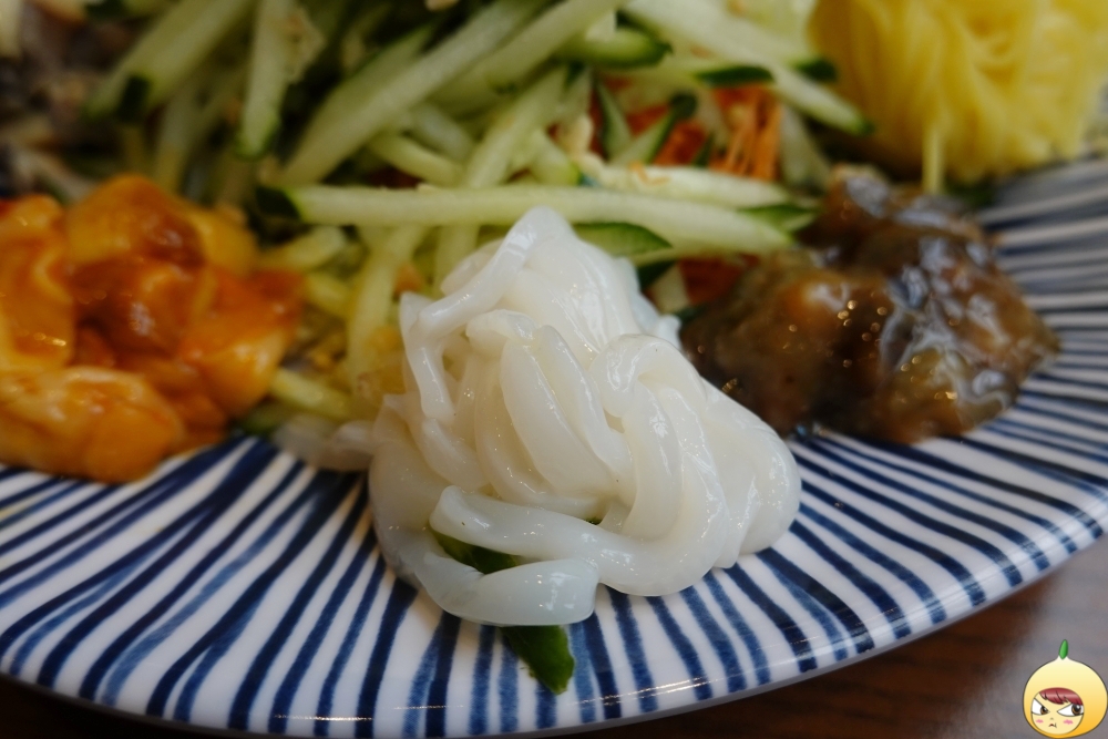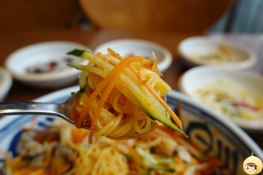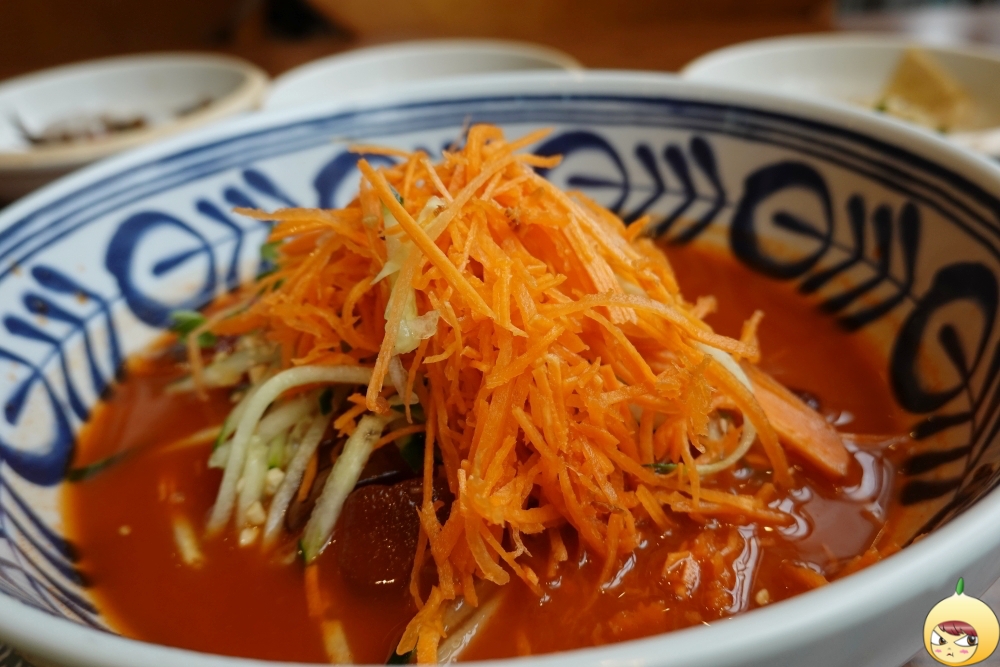 노란면은 아마도 치자 국수가 아닐까 싶다. 국수 뒤로 보이는 거대 산은 죄다 채소뿐이다. 채소부터 육수에 넣고 있는데, 이런 무순과 오이만 있는 줄 알았는데, 당근도 엄청 많다. 오이에 비해 굵기가 얇아서 당근 맛이 강하게 나지 않는다.