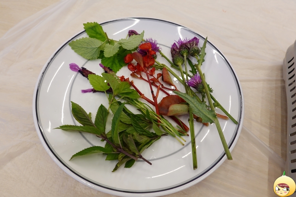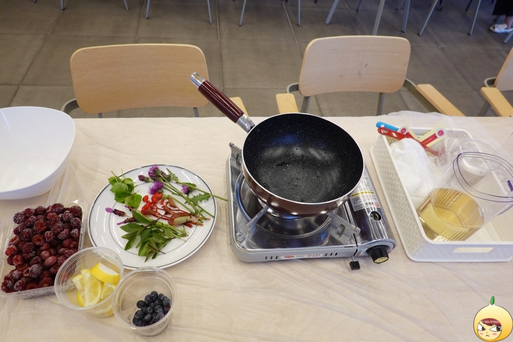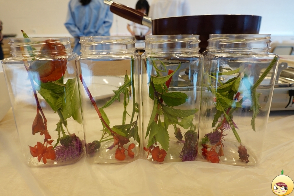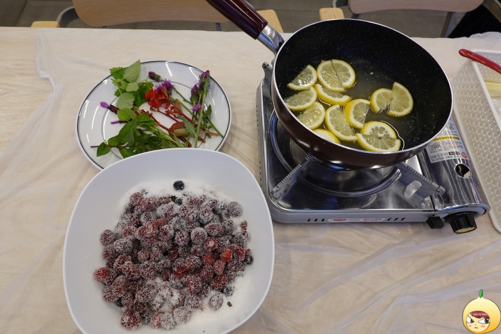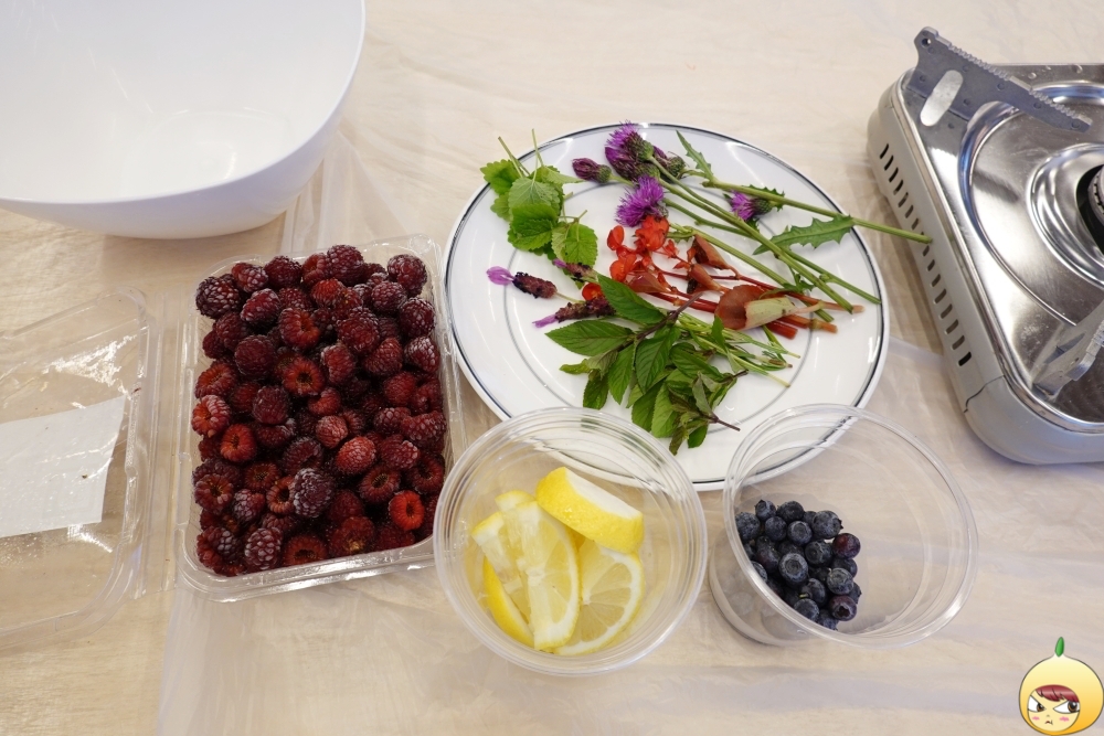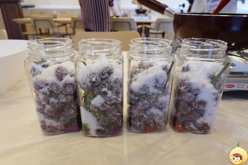 엉겅퀴와 민트 등 허브는 종류별로 하나씩 담는다. 그리고 설탕 옷을 입은 베리를 넣고, 레몬설탕물과 일반식초를 넣으며 베리식초가 완성된다.