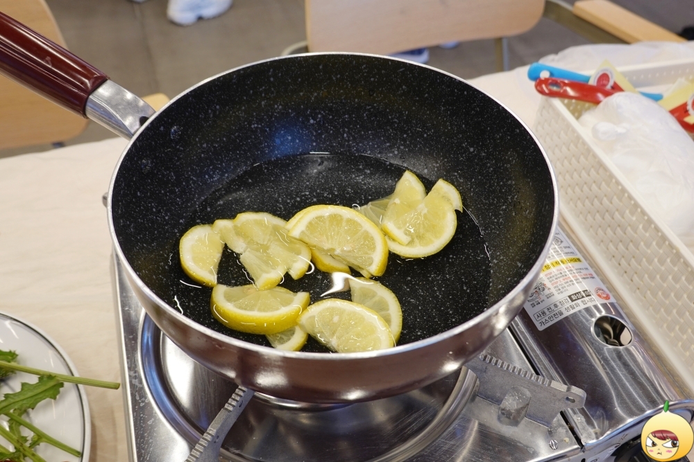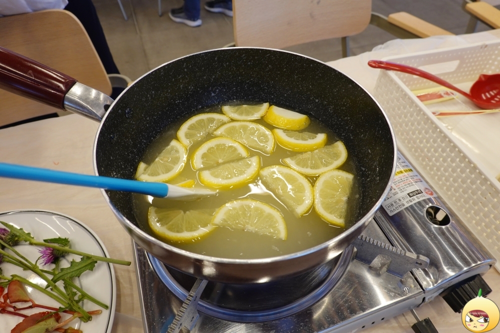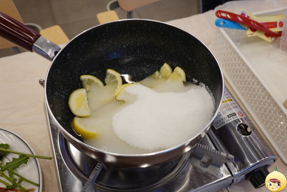 물을 넣고, 레몬을 넣고, 생각보다 꽤 많은 설탕을 넣는다. 그리고 녹을때까지 저어준다. 참, 설탕 다음으로 구운유자소금은 아주 소량이 들어갔다.