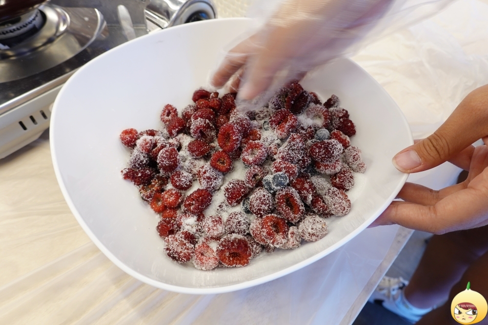 산딸기와 블루베리를 커다란 볼에 담고, 또 다량의 설탈을 넣어 섞어준다. 개인적으로 바나나식초를 만든 적이 있는데, 원래 식초를 만들때 설탕을 많이 넣나보다. 단맛을 극히 싫어해서 혼자 만들었다면 설탕을 덜 넣었을텐데, 혼자가 아니다 보니 하라는대로 다 넣었다.