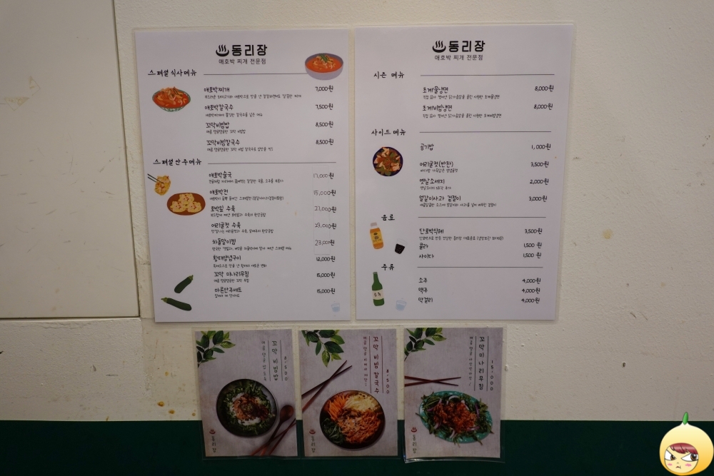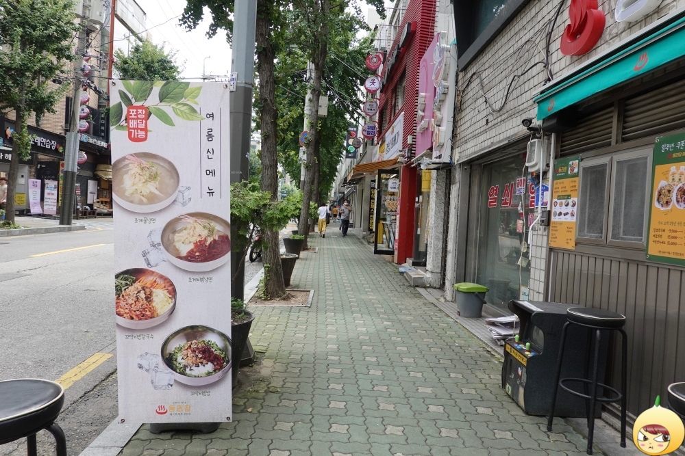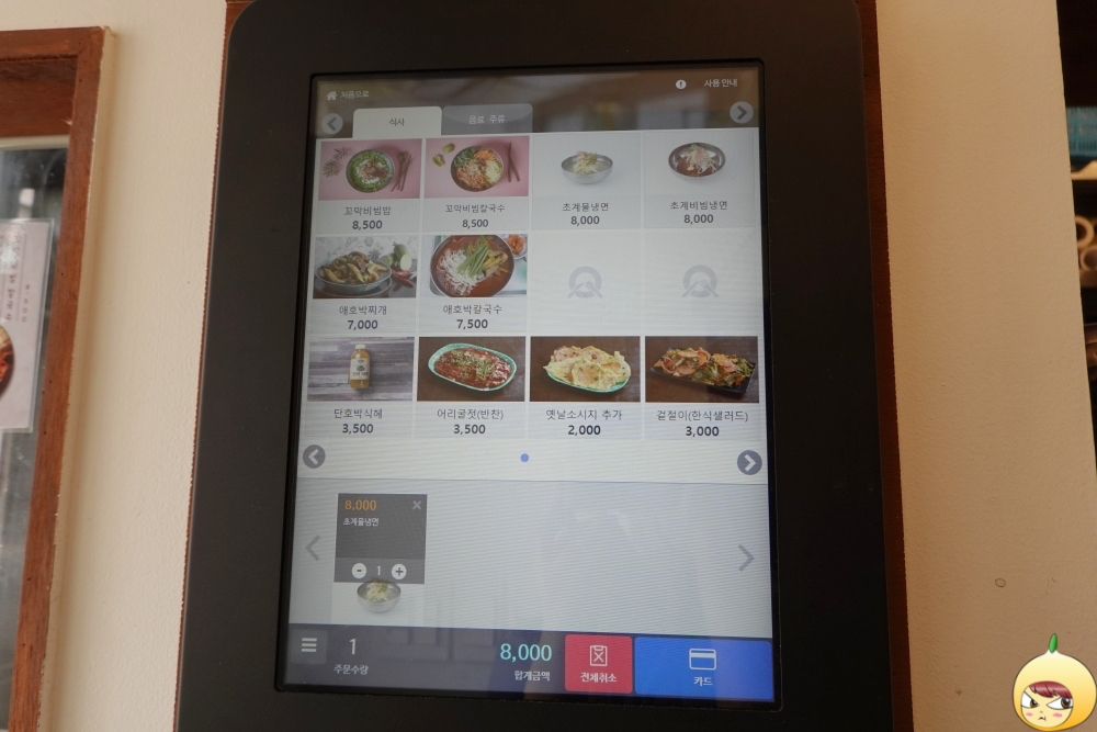 주방 옆 좁은 공간을 지나 안으로 들어가야 한다. 그전에 주문부터, 여름별미는 작년에도 먹었으니 알고 있는데, 진짜로 신메뉴가 생겼다. 꼬막비빔밥에 꼬막비빔칼국수라, 꼬막 시즌은 아니지만 새콤달콤할 거 같은 비빔칼국수가 살짝 끌린다. 하지만 더우니깐, 주문은 초계물냉면(8,000원)이다.