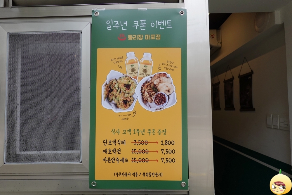 더구나 일주년 이벤트쿠폰까지 받았으니, 아니 올 수 없다. 꼬막비빔칼국수 먹고 후식으로 단호박식혜를 마시고, 요즘 혼술을 멀리하고 있는데 애호박전에 마른안주라니 갈색이로 갈증해소하러 가야겠다. 참, 동리장은 브레이크타임이 있다. 오후 3시부터 5시까지다. 그리고 쿠폰기간은 8월 31일까지이니 서둘러야겠다.
