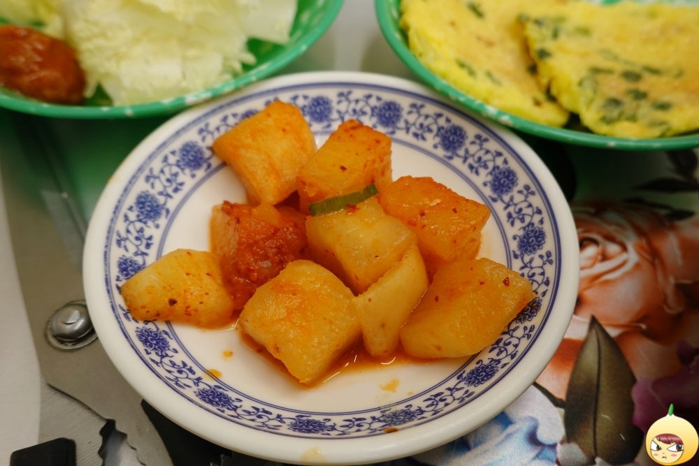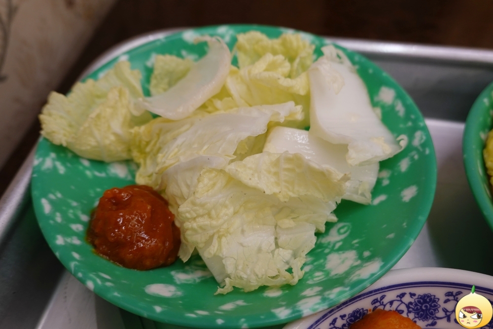 3가지 기본 찬 중 깍두기와 노란 알배추 그리고 쌈장이다. 늘 오이가 나왔는데 이번에는 배추다. 어차피 둘다 좋아하니 상관없다. 달기만 한 오이피클보다는 아삭한 알배추가 더 좋을 듯 싶다.