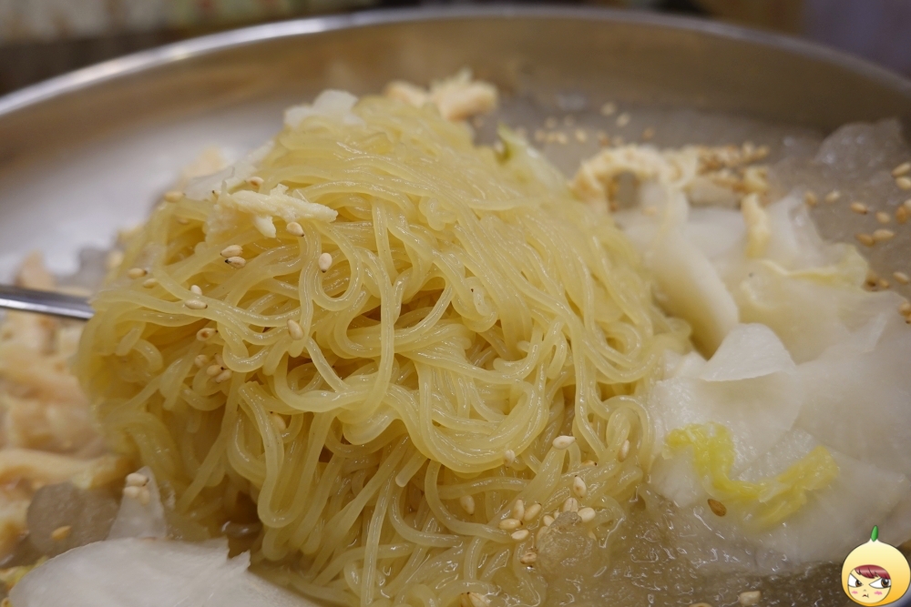 개인적으로 다리살보다는 가슴살을 좋아하는데, 동리장 초계물냉면은 닭가슴살이 잔뜩 올려져 있다. 손질이 잘되어 있어 질기거나 퍽퍽한 느낌은 전혀 없다. 닭살을 치우면, 백김치인듯 무절임인듯 무가 가장 많고 그 다음으로 배추, 오이 순이고, 새콤함과 아삭함을 담당하고 있다.